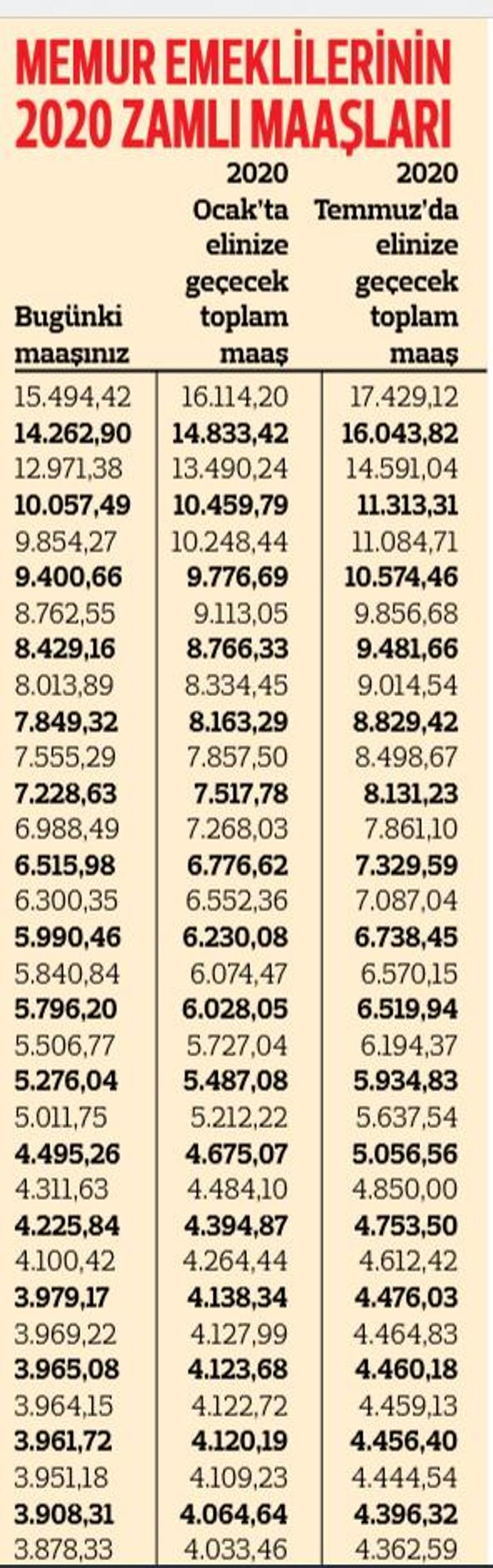 Memur ve emekli 2021 zamlı maaşları. 2021 yılında kira zammı ne kadar olacak? İşte tahminlere göre emekli zammı tablosu. Tabloda 2020 aralık maaşa yansıyan zam tutarı, temmuz ayındaki 5.75 zam oranı üzerinden hesaplanmıştır. Enflasyon oranının açıklanmasıyla memur ve emekli maaş zammı da belli oldu.
